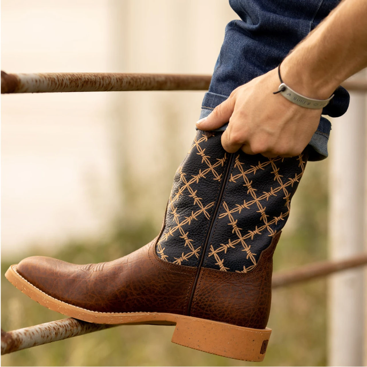 - Molded rubber outsole integrated with blended rice husk featuring a 1.5″ tall walking heel and integrated spur shelf. Blended rice husk is an agricultural by-product that is typically thrown away.